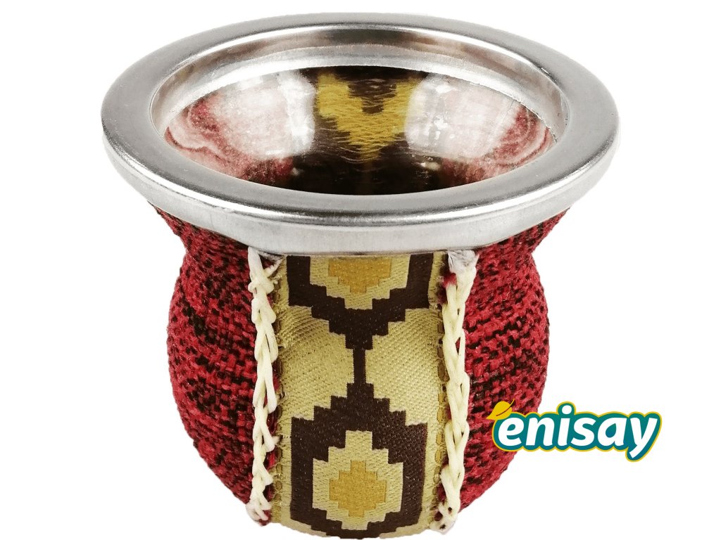 Hodinový pohárkový dýňový materiál, obalený červeným ručně tkaným plátnem s unikátním vzorem.